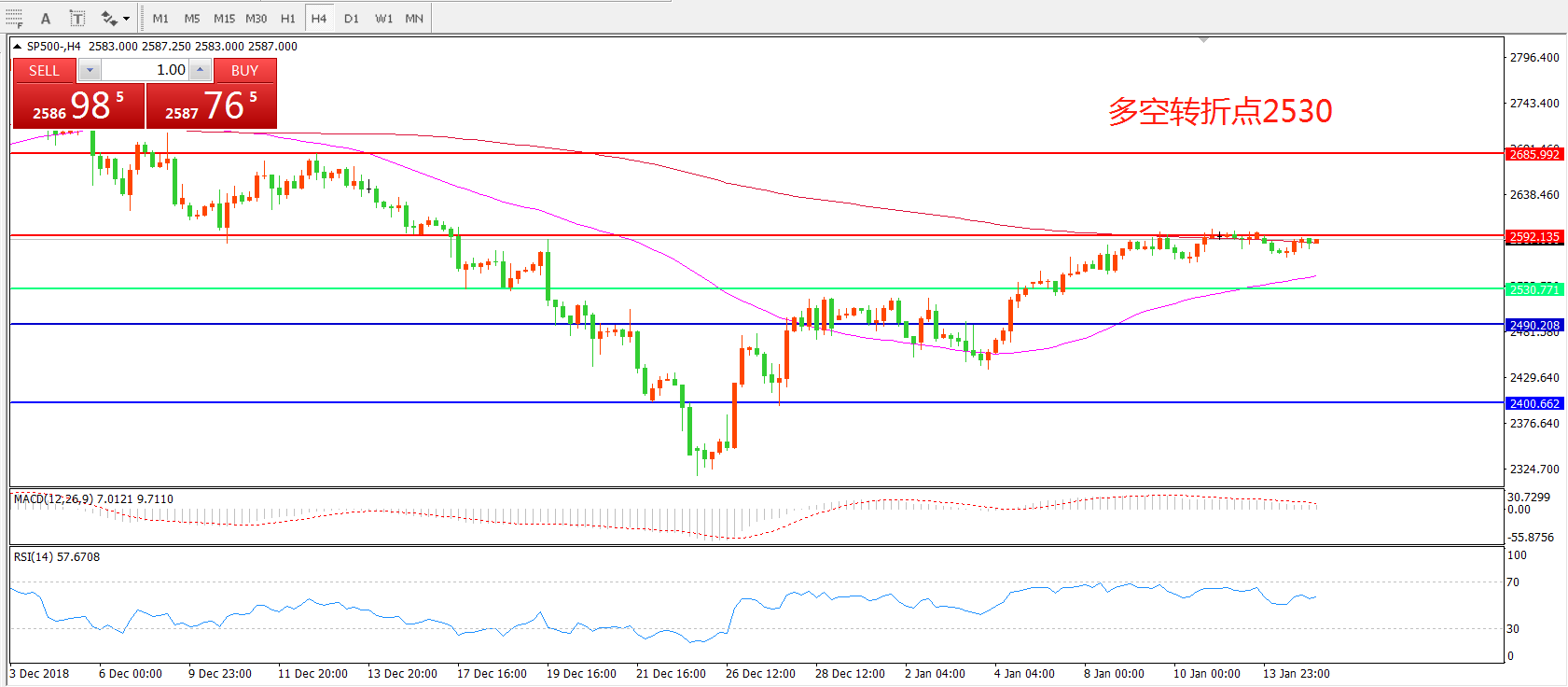 4小时图看,SP500站2490后维持小幅整理态势,均线系统逐渐走平,MACD红柱缩短,RSI指标出现拐头,短期看有一点回落风险。