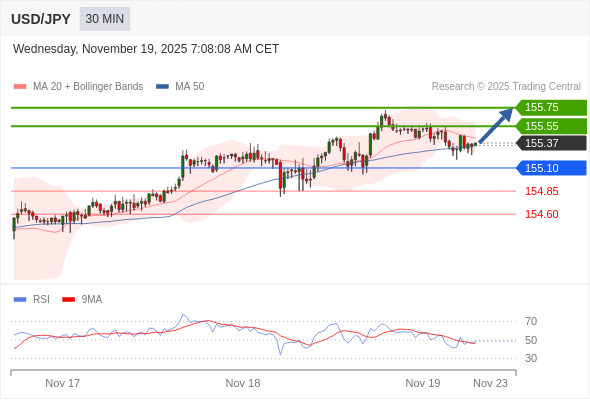 在 155.10 之上,看涨,目标价位为 155.55 ,然后为 155.75 。