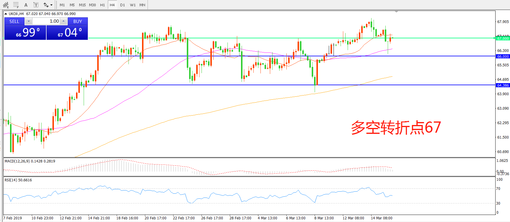 4小时图看,油价维持盘整姿态,多空双方对67美金一线反复争夺,,均线系统呈多头排列,MACD红柱减少,RSI指标掉头,短期有出现回调可能。