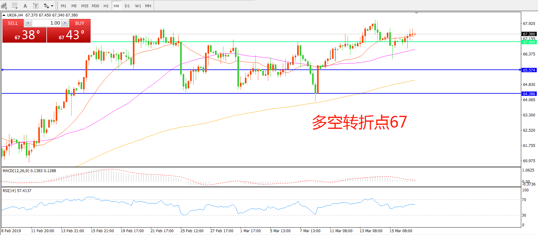 4小时图看,布油价维持高位盘整姿态,波幅偏窄,67美金一线已经成功站稳,均线系统呈多头排列,MACD红柱减少,RSI指标走平,短期以多头思路为主。