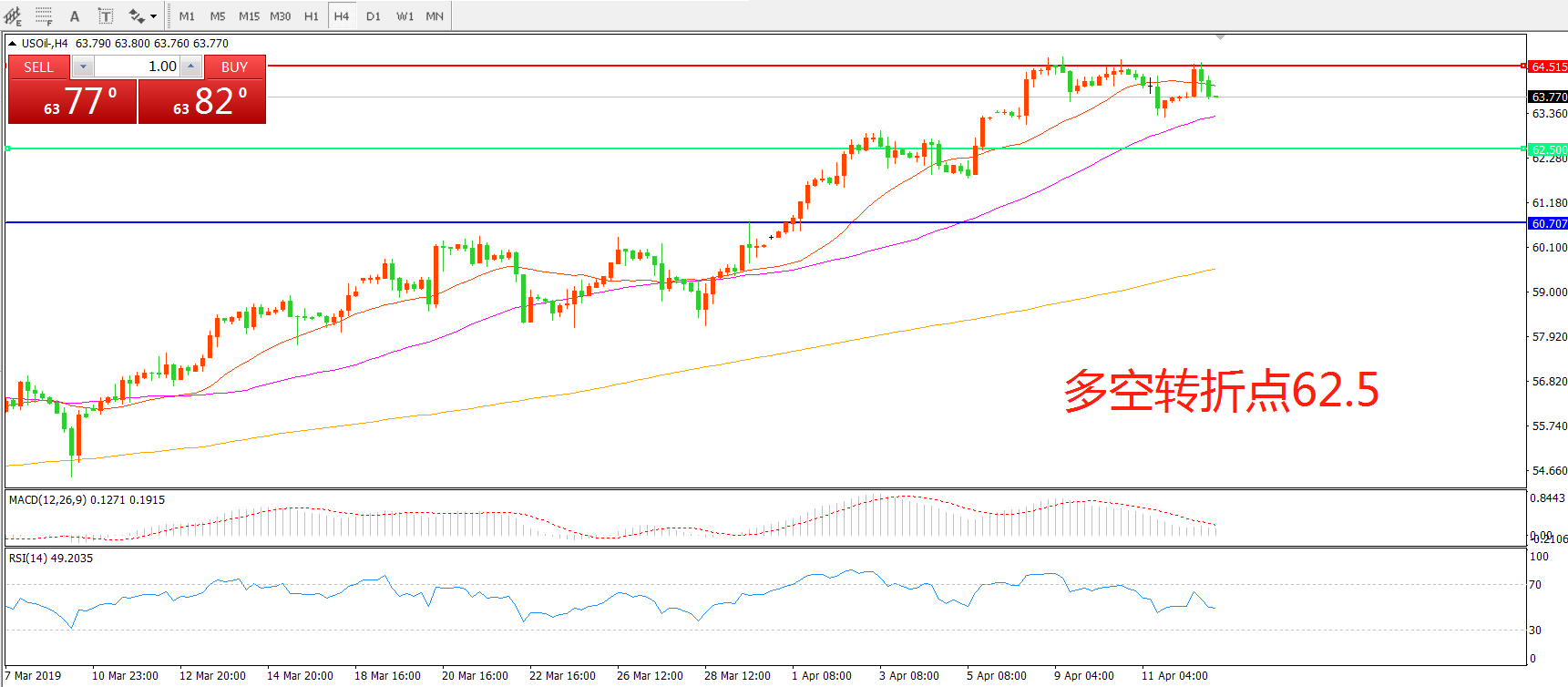 4小时图看,油价连续上行后,触碰上方64.5阻力后有所回落,显示上方阻力依然较强,均线系统依然呈多头排列,MACD红柱减少,RSI指标走平,短期有回落可能,但整体走势依然偏多。