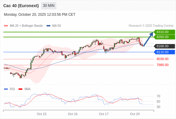 法国CAC指数期货 (Euronext) (X5) 当日内: 在8110.00之上,看涨。