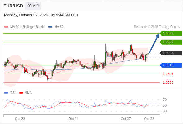 在 1.1610 之上,看涨,目标价位为 1.1650 ,然后为 1.1665 。