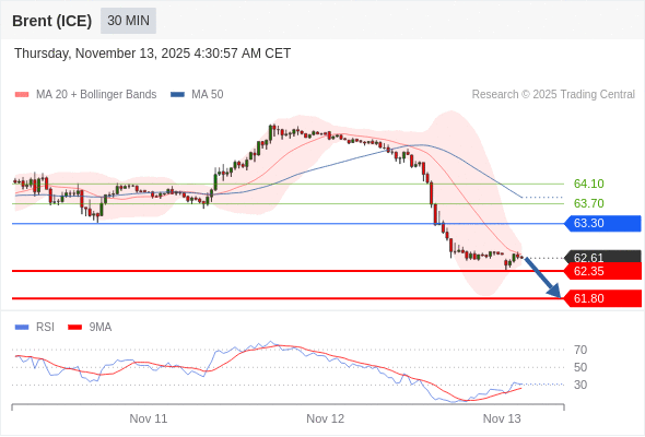 在 63.30 之下,看跌,目标价位为 62.35 ,然后为 61.80 。