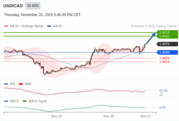美元/加元 当日内 : 看涨,当 1.4048 为支撑位。