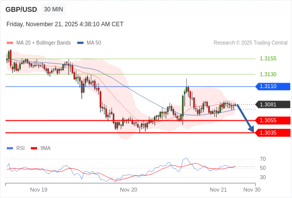 在 1.3110 之下,看跌,目标价位为 1.3055 ,然后为 1.3035 。