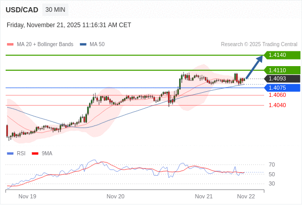 在 1.4075 之上,看涨,目标价位为 1.4110 ,然后为 1.4140 。