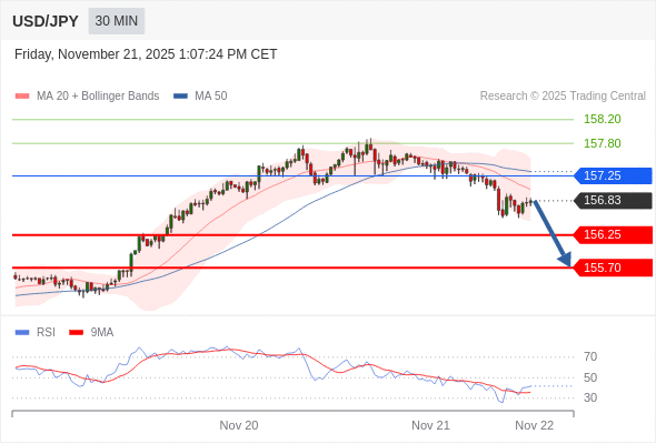 在 157.25 之下,看跌,目标价位为 156.25 ,然后为 155.70 。