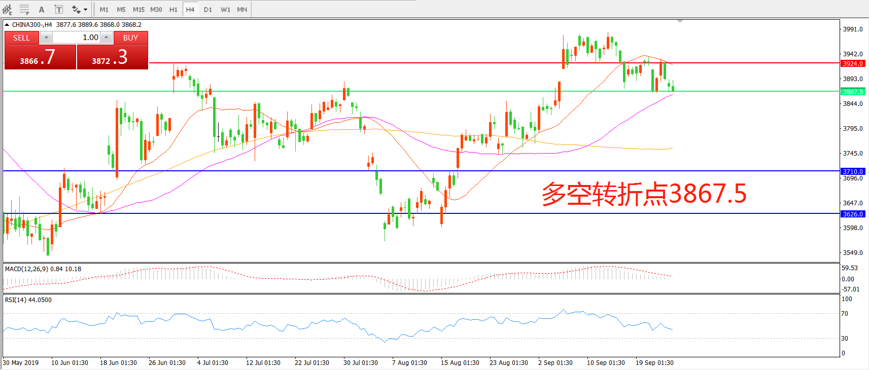4小时图看,沪深300延续高位震荡,3924成为上方阻力,3867.5成为下方支撑,MACD红柱减少,RSI指标向下,日内依然有回落风险。