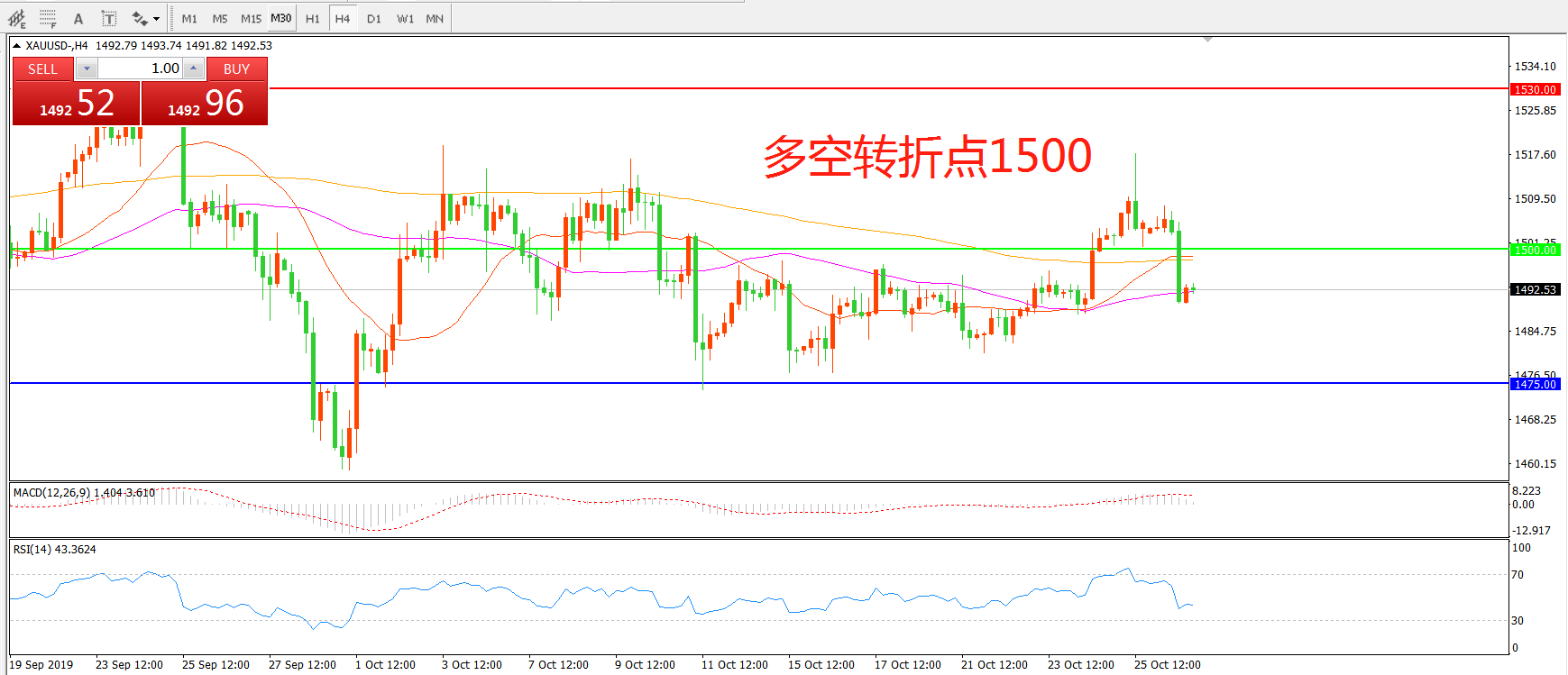 周一(10月28日),刘鹤应约与美国贸易代表莱特希泽、财政部长姆努钦通话,双方同意妥善解决各自核心关切,确认部分文本的技术性磋商基本完成,市场避险情绪回落,现货黄金承压重挫逾10美元,仅失守1500关口,还一度跌破1490关口,最终收报1491.56美元/盎司。本周是一个非常重要的美国经济数据周,美联储政策会议将从周二开始,而重要的美国非农就业报告则在周五发布。