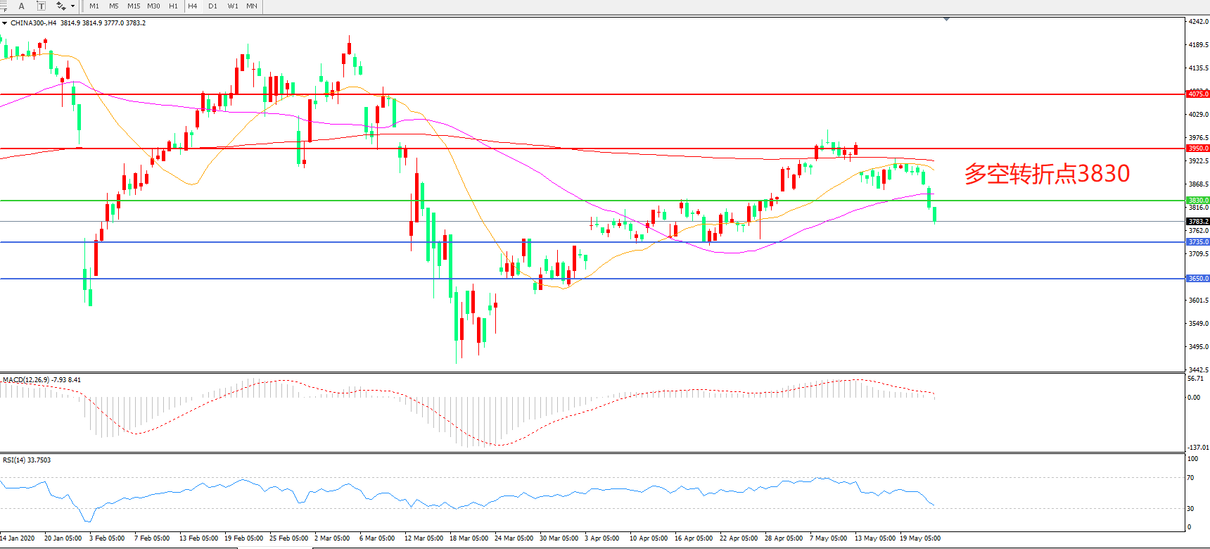 4小时图看,沪深300连续长阴下破,前期涨势基本被吞没,短期走势偏空, 均线系统成为上方阻力, MACD红柱减少,RSI指标向下,日内延续下行概率较大。