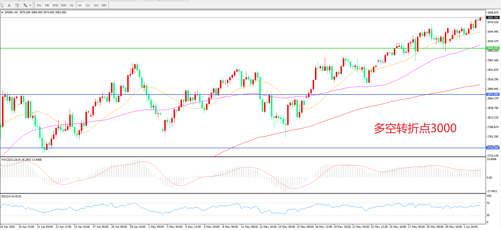 周二(6月2日),虽然席卷全美各地的骚乱仍在持续发酵,但投资者更聚焦经济重启所带来的活力,标普500震荡走高,收报3075.25点,收盘前美国军方的生物专家称年底之前有望完成新冠疫苗的研发。值得注意的是,标普500指数较其在3月23日创造的近期低点2191.86点已反弹超过40%,较其近期历史最高点差距为9.2%。
