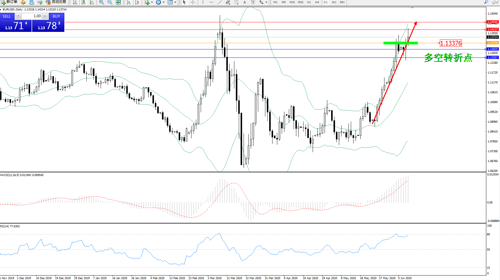 交易策略:1.13376上方看涨,目标1.14127、1.14545