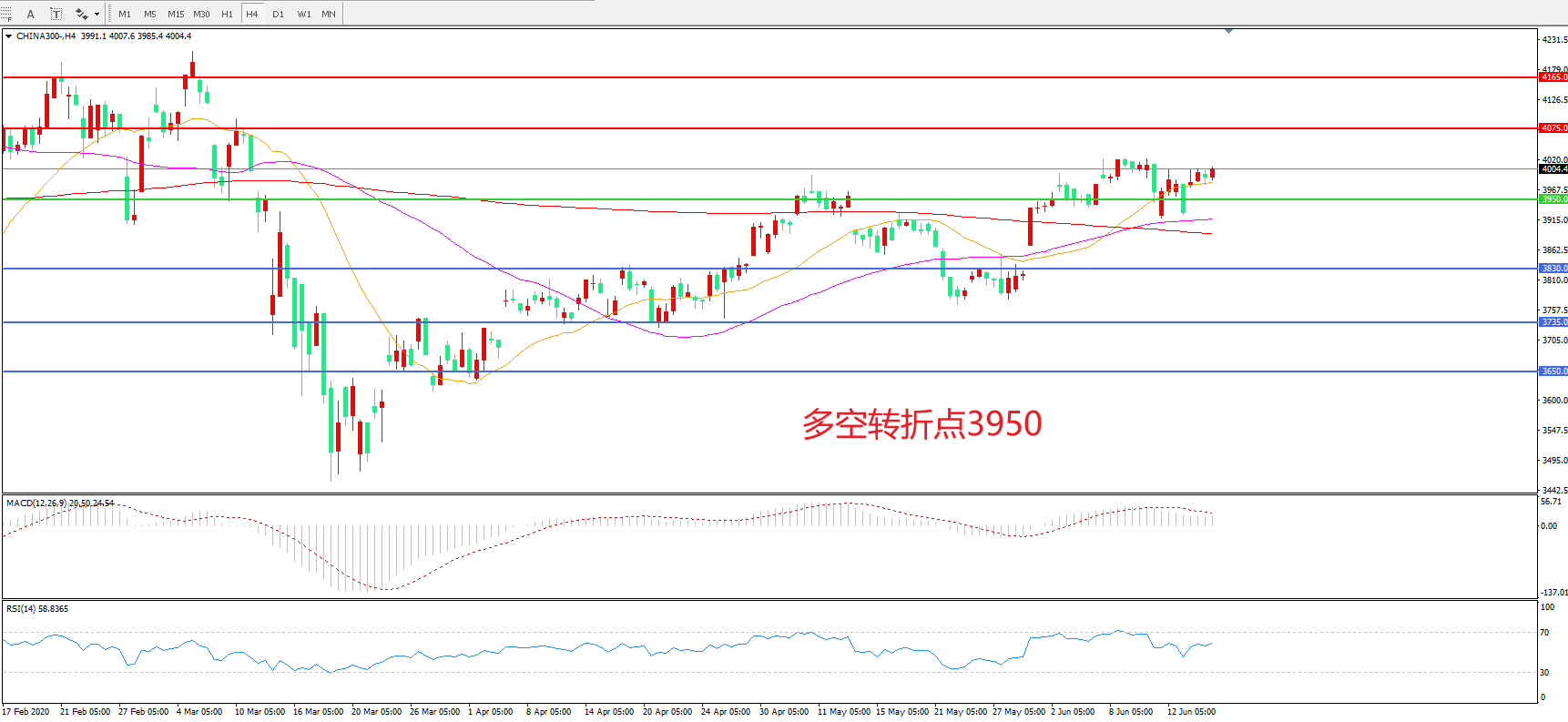 4小时图看,沪深300延续高位震荡走势,3950成为短期多空分水岭,55周期均线成为支撑,均线系统走平,MACD红柱缩短,RSI指标向下,日内延续震荡概率较大。