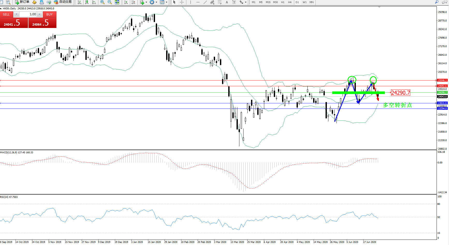 香港恒生指数629日(周一)收盘下跌248.71点,跌幅1.01%,报24301.28点;港股三大指数均现高开低走行情,市场整体表现疲弱。国指跌0.97%9757点。南下资金逆势净流入22.54亿港元,大市成交额为1330.19亿港元。前期强势的半导体板块回落大跌,中芯国际跌7%;内险股全线下挫。腾讯早盘升近2%,尾盘回落小幅收涨;康基医疗首日上市暴涨98.85%。端午节期间,外围股市跌声一片,下跌因素大家都很清楚,无非是公共卫生事件的再度发酵加上美国对欧盟发起的关税战等等。市场传银行将拿券商牌照,导致券商股集体下跌。对于这个消息,证监会没有肯定也没有否认。而银行方面包括中行和建行的表态都是:未了解相关信息。