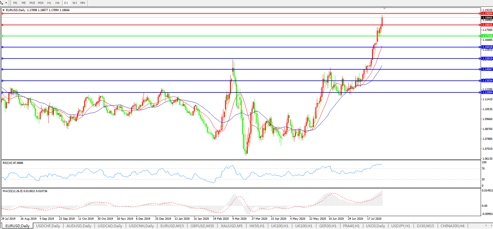 技术面简析:日图均线维持多头排列,汇价飙升再创新高,MACD运行于0轴上方且量能再度回归 ,RS持续攀升,预计短期汇价大概率将回落修正,关注1.19关口压制。