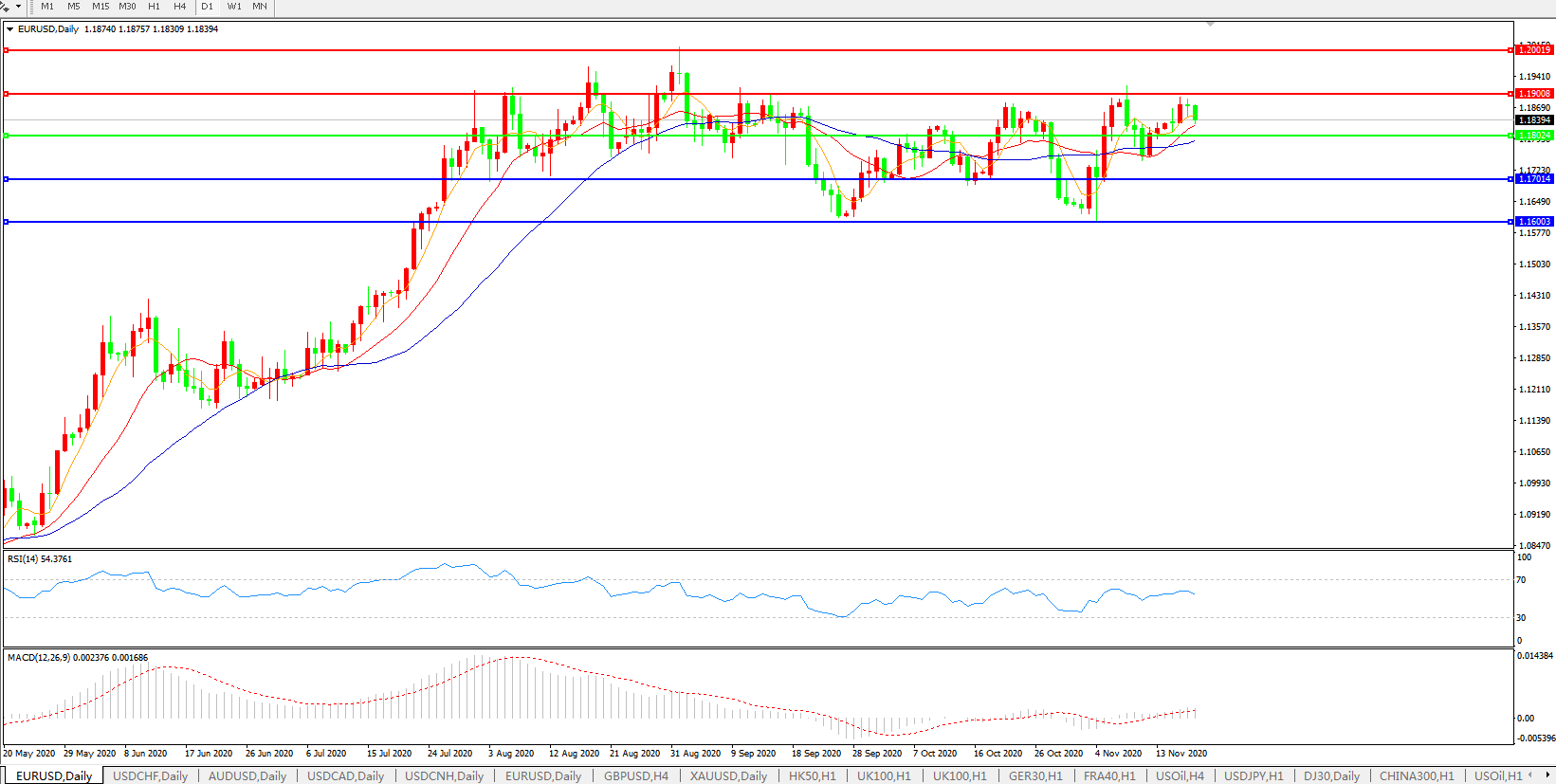 欧元兑美元在周三上攻1.19关口再度无果,虽然日内欧洲官员对疫情与经济前景予以了偏向的乐观的评述,但是在本周稍后专门讨论疫情对策的欧盟峰会召开前,市场情绪依旧偏于谨慎,加之日内欧元区CPI数据依旧只是差强人意,令欧洲央行宽松预期仍被憧憬,也限制了欧元汇价的上升空间; 但业内机构瑞信指出,在美元受到美国政局风险打击,走势持续疲软的大背景下,欧元继续走强仍是大势所趋,后市若欧盟峰会敲定了进一步的救助资金安排,欧元兑美元将大概率上破上周高点1.1920处的关键阻力位,这将打开升向年内高点1.2011的通道。而只要日内守住1.1834这一关键趋势支撑,上行趋势就将无恙,之后在1.1808处还有进一步的强力支撑,只有在跌破上周低位1.1746后,趋势才会出现反转