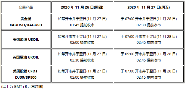 1.外汇货币对和其他股指产品的交易不受本次美国感恩节假期休市影响。