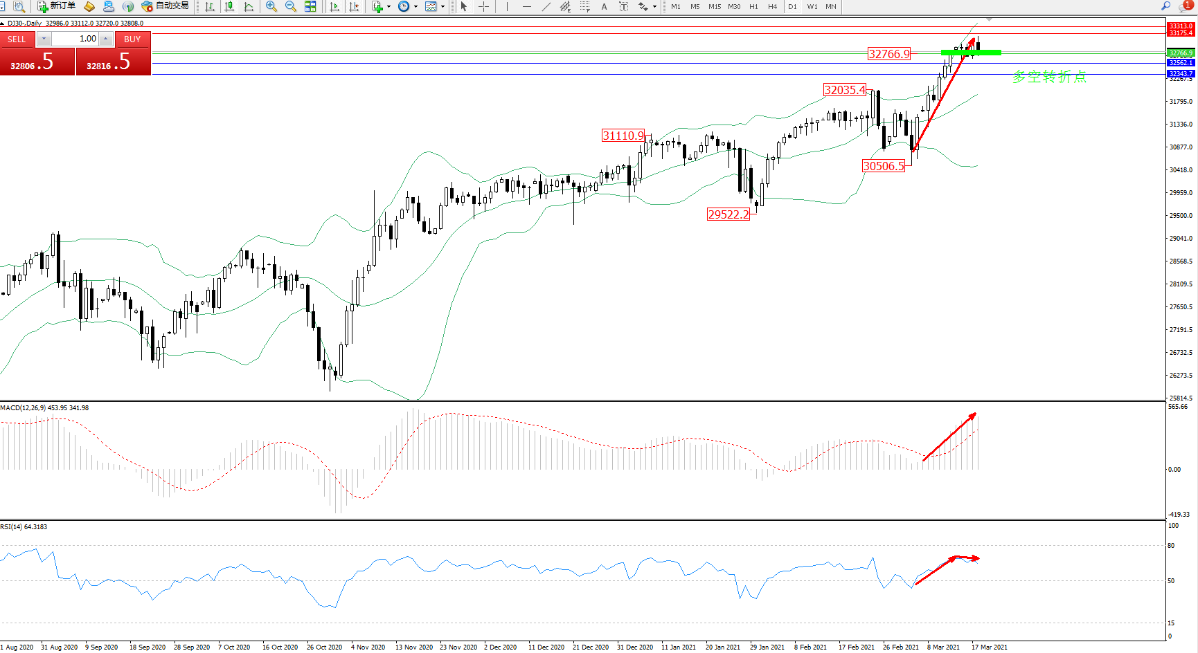 道琼斯指数3月18日(周四)收盘下跌153.00点,跌幅0.46%,报32862.37点;美股三大股指齐收跌,美债收益率涨破关键水平,交易员愈发相信美联储将允许通胀率在经济反弹过程中高于目标。10年期美债收益率一度上涨11个基点,至1.75%,为2020年1月以来的最高水平,30年期收益率自2019年8月以来首次升至2.5%;市场的通货膨胀预期指标位于多年高点附近,交易员下调对美联储最早明年年末开始收紧货币政策的预期。纽约市场上午,美国国债收益率回吐部分涨幅,但仍保持较高水平;随着经济复苏取得进展,鲍威尔给10年期和30年期收益率进一步上行开了绿灯。在这些假设受到挑战之前,潜在的通货膨胀预期将保持高位,并且仍将是美国国债看跌趋势的基石。