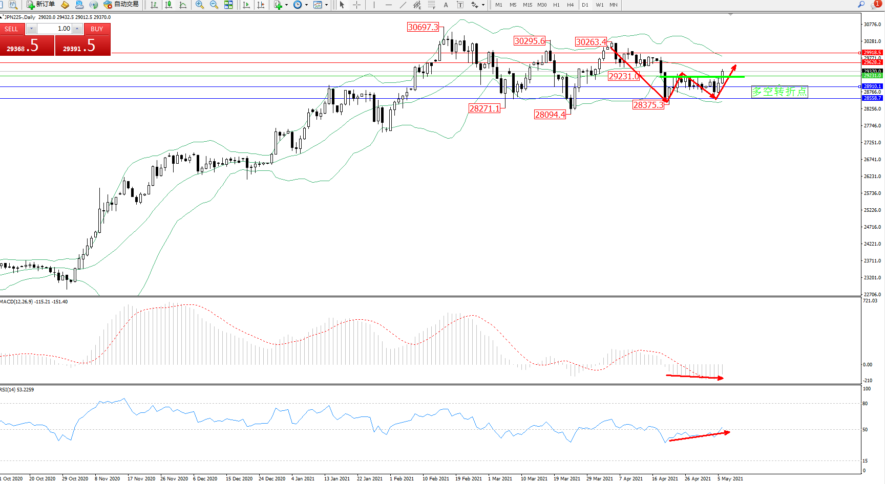 技术点评:长时间维持在布林带指标通道内处于宽幅震荡走势中,空头动力司机入场跌破布林带指标下轨附近节点后不断向下移动中,低位抵达28375附近得到短暂支撑多头伺机入场,反转回升后整理平移后,触及布林带指标中轨附近节点,破位强势拉升,进入中上轨区间向上移动,布林带指标呈张口走势后开始收口,MACD指标处于0轴线下方维持震荡平移,RSI指标空头动力弱势纠结于50均衡线下方空头区域弱势整理后回升;