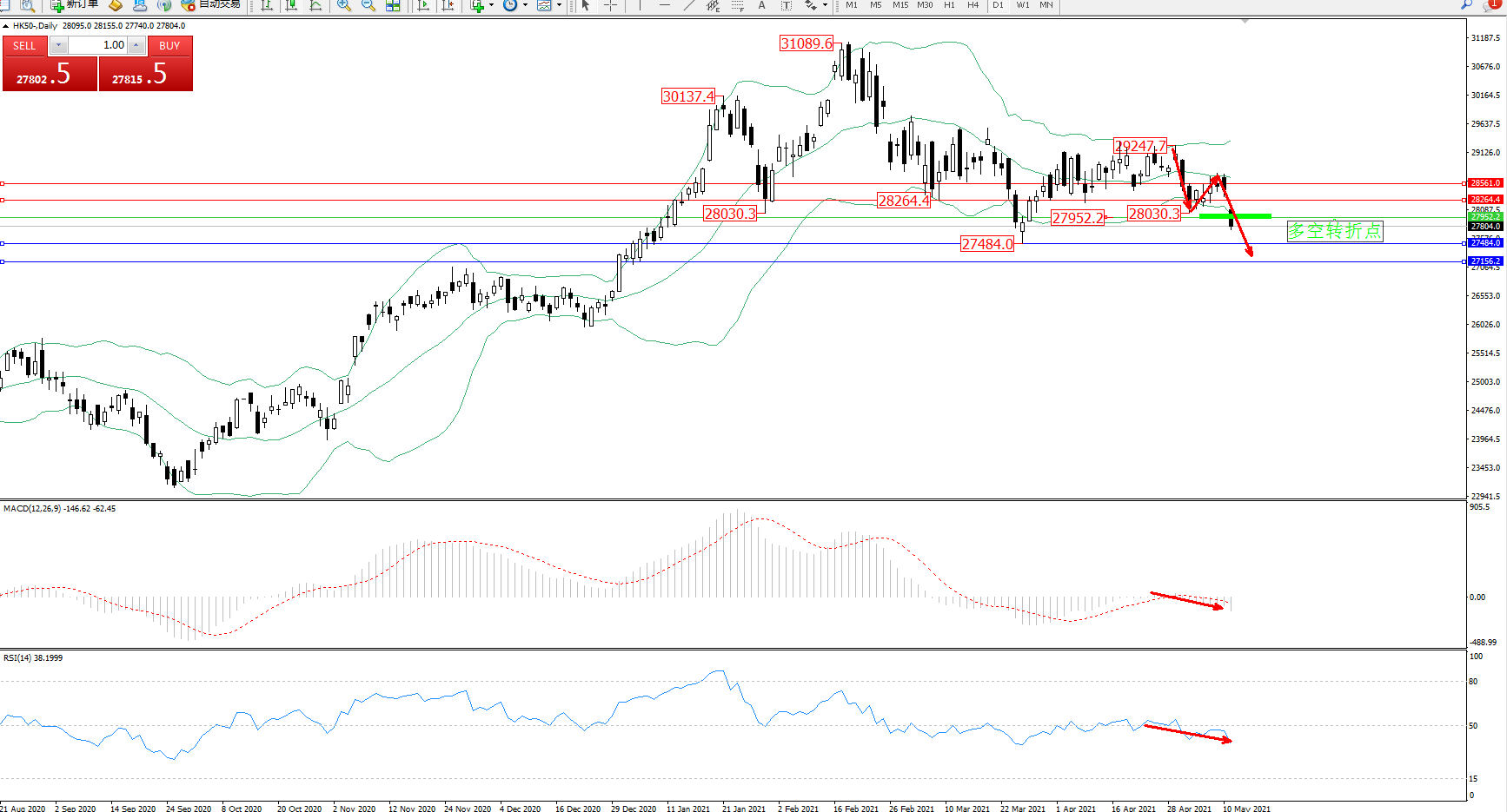 技术点评:长时间维持在布林带指标中上区间持续窄幅震荡后,空头动力伺机开始入场,呈阶梯式震荡下行,跌破布林带指标下轨附近节点后有继续向下移动态势,布林带指标呈缓慢张口走势中,前期低位27484位置近在咫尺破位在即,MACD指标处于0轴线下方弱势徘徊中,RSI指标处于50均衡线下方窄幅震荡向下移动;