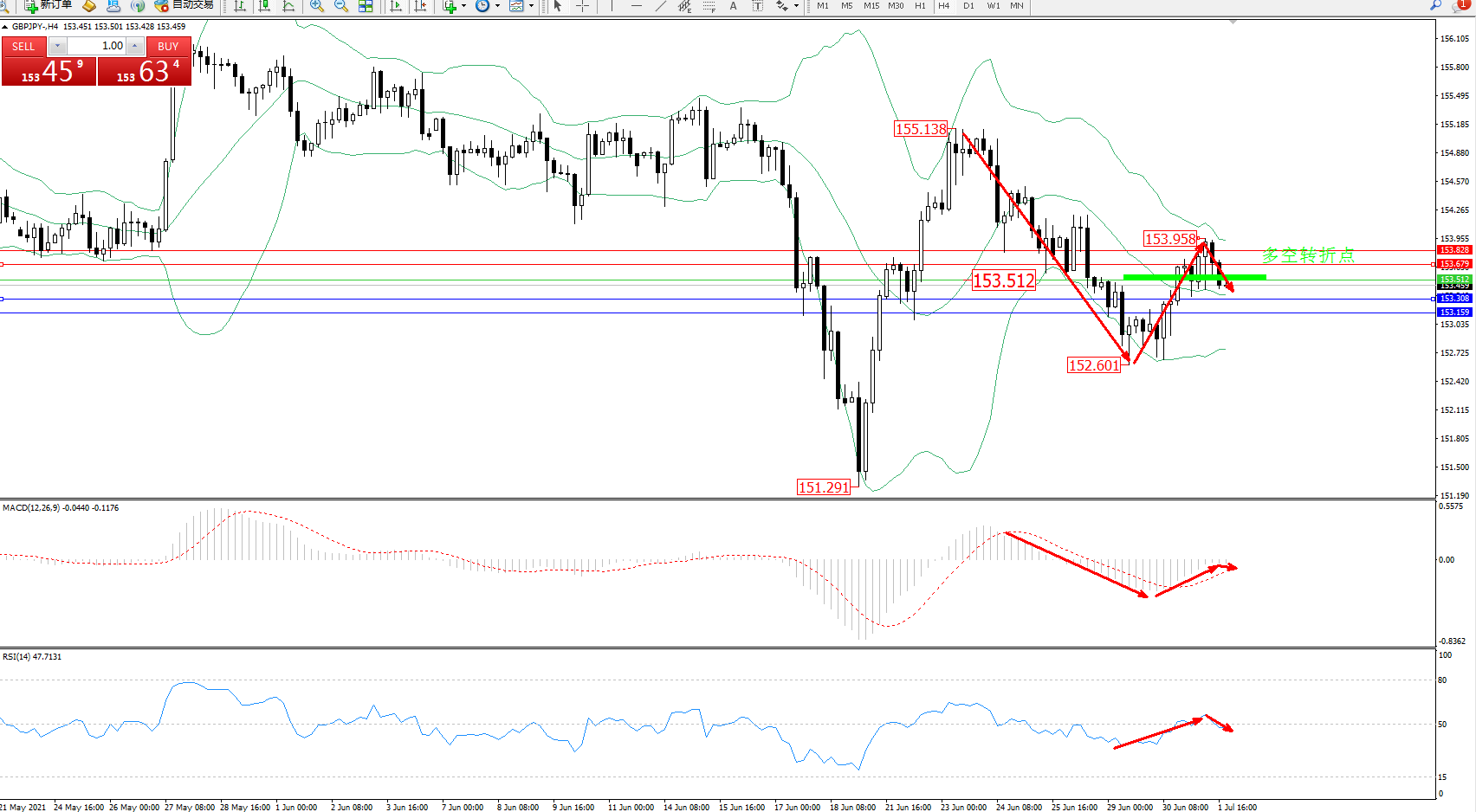 技术点评:高位空头动力延续布林带指标中下轨区间持续震荡下行,低位抵达152.601位置后短暂回升,抵达153.958位置遇阻再度回撤下行,空头下行趋势态势良好,即将触及中轨附近节点,布林带指标呈收口走势后开始平移持续收窄,MACD指标处于0轴线下方空头区域低位缓慢回升后平移,RSI指标处于50均衡线附近弱势徘徊中;