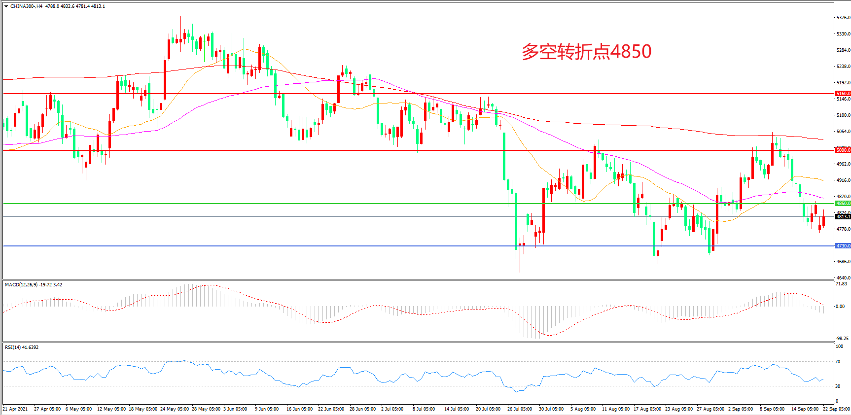 4小时图看,沪深300跳空低开后震荡反弹,短期行情有所回暖,均线系统成为阻力,4850成为短期多空分水岭,MACD绿柱增加,RSI指标走平,日内延续震荡概率较大。