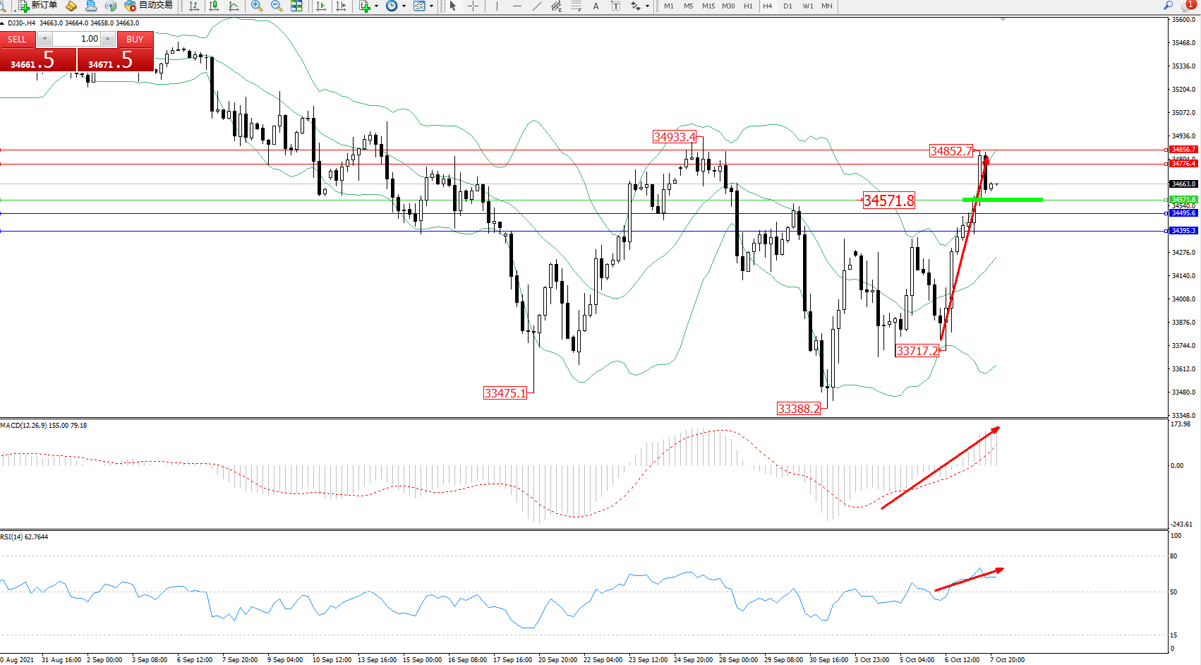 道琼斯指数DJ30——4小时K线图显示: