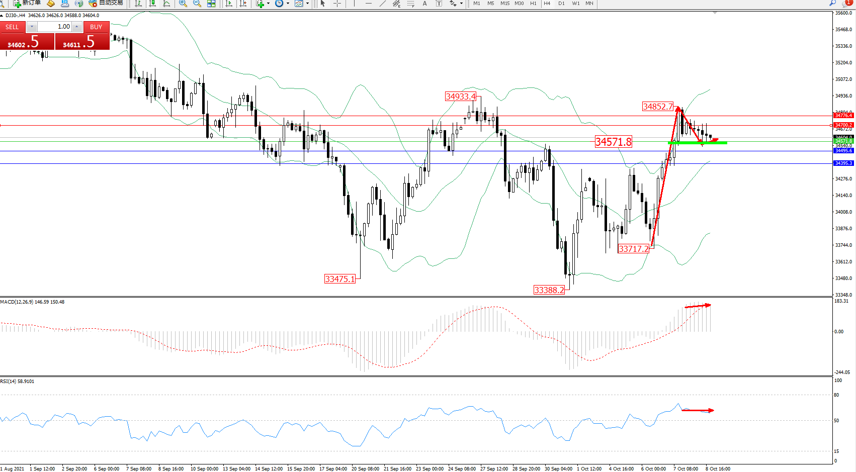 技术点评:多头动力持续震荡上扬,高位抵达34852附近遇阻整理回撤,短期多头后续动力欠缺,布林带指标呈收口走势上移中,MACD指标处于多头区域维持整理平移中,RSI指标处于多头区域维持徘徊中;