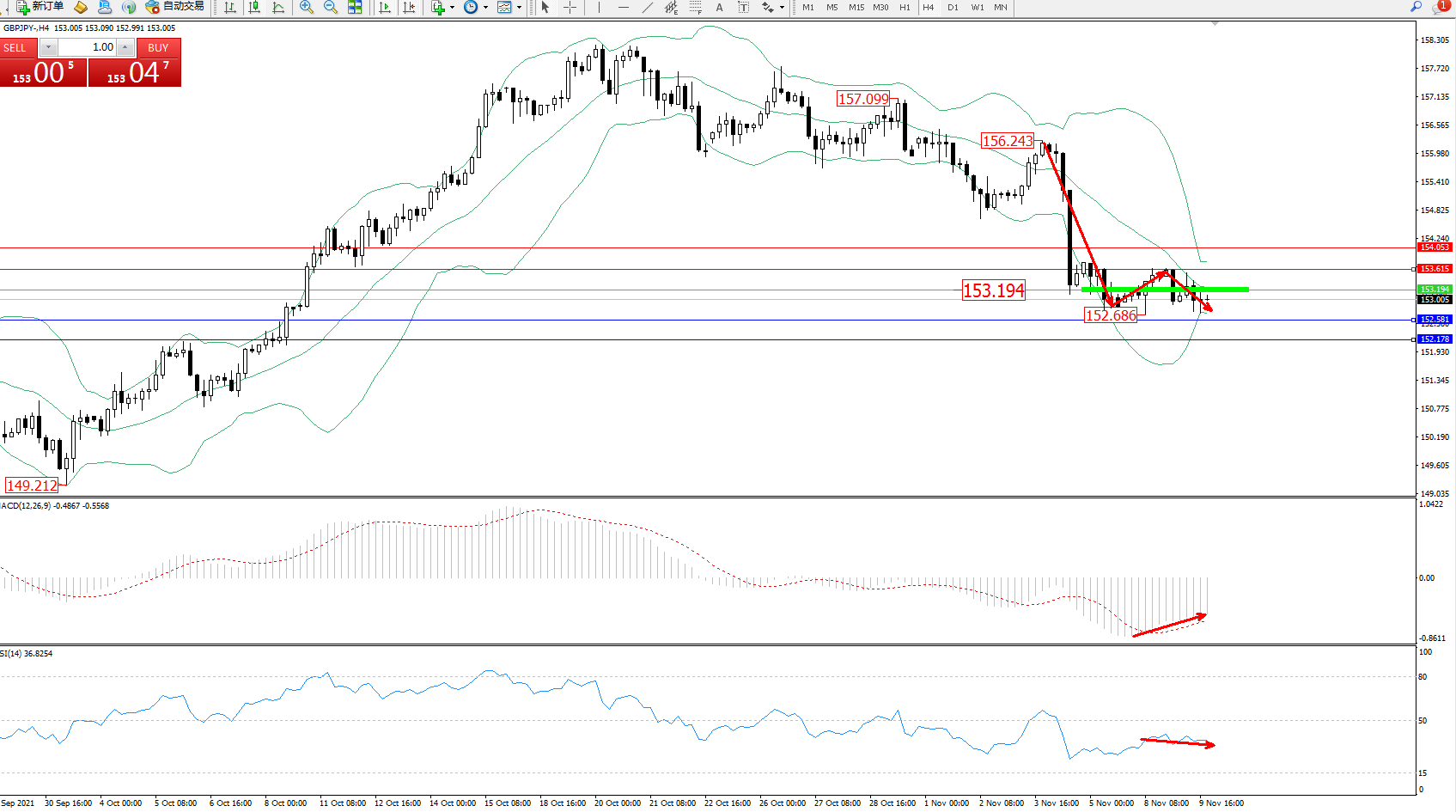 交易策略:153.194下方看跌,目标152.581、152.178