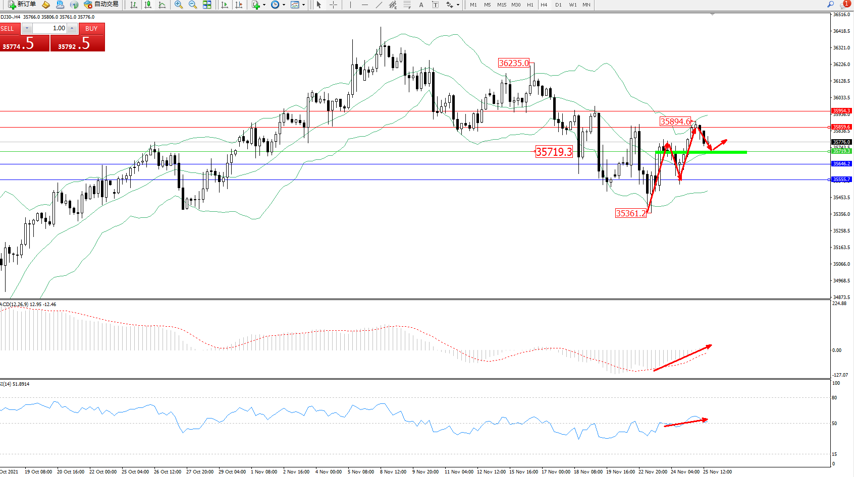 美国纽约证券交易所感恩节假期,提前于北京时间11月27日02:00收市。道琼斯指数11月24日(周三)收盘下跌8.63点,跌幅0.02%,报35805.17点;美股收盘,道指接近平收; 随着欧洲央行、日本央行和瑞士央行等主要央行开始收紧政策,美元涨势可能在2022年下半年触顶。美联储的紧缩周期应该已经在进行中,而且市场可能已经有一定的预期。虽然市场“正郑重预期美联储提前启动紧缩周期的风险”,但欧洲央行、瑞士央行和日本央行晚些时候也可能开始启动,以及英国央行推迟启动紧缩,这些或许尚未完全反映在美元定价中不过,在风险情绪减弱和新一波疫情来袭之际,美元未来数月仍有上涨空间。