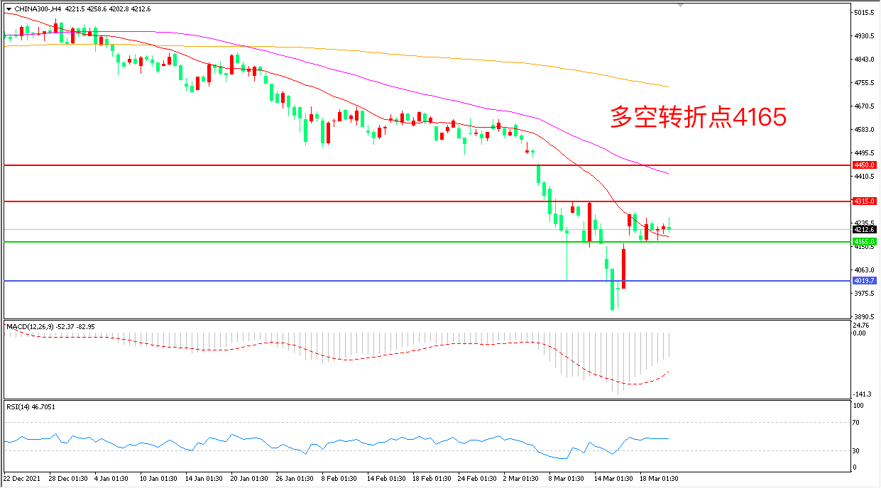 4小时图看,沪深300以4165为依托展开整理,短期波幅不大, MACD绿柱缩短,RSI指标走平,日内延续震荡概率较大。