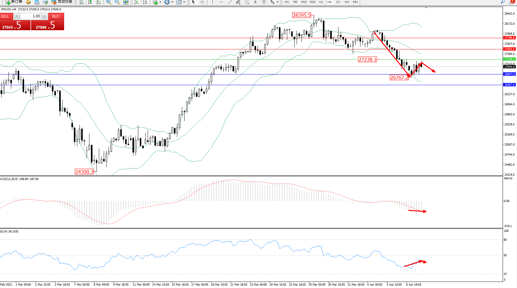 日经指数JPN225——4小时K线图显示: