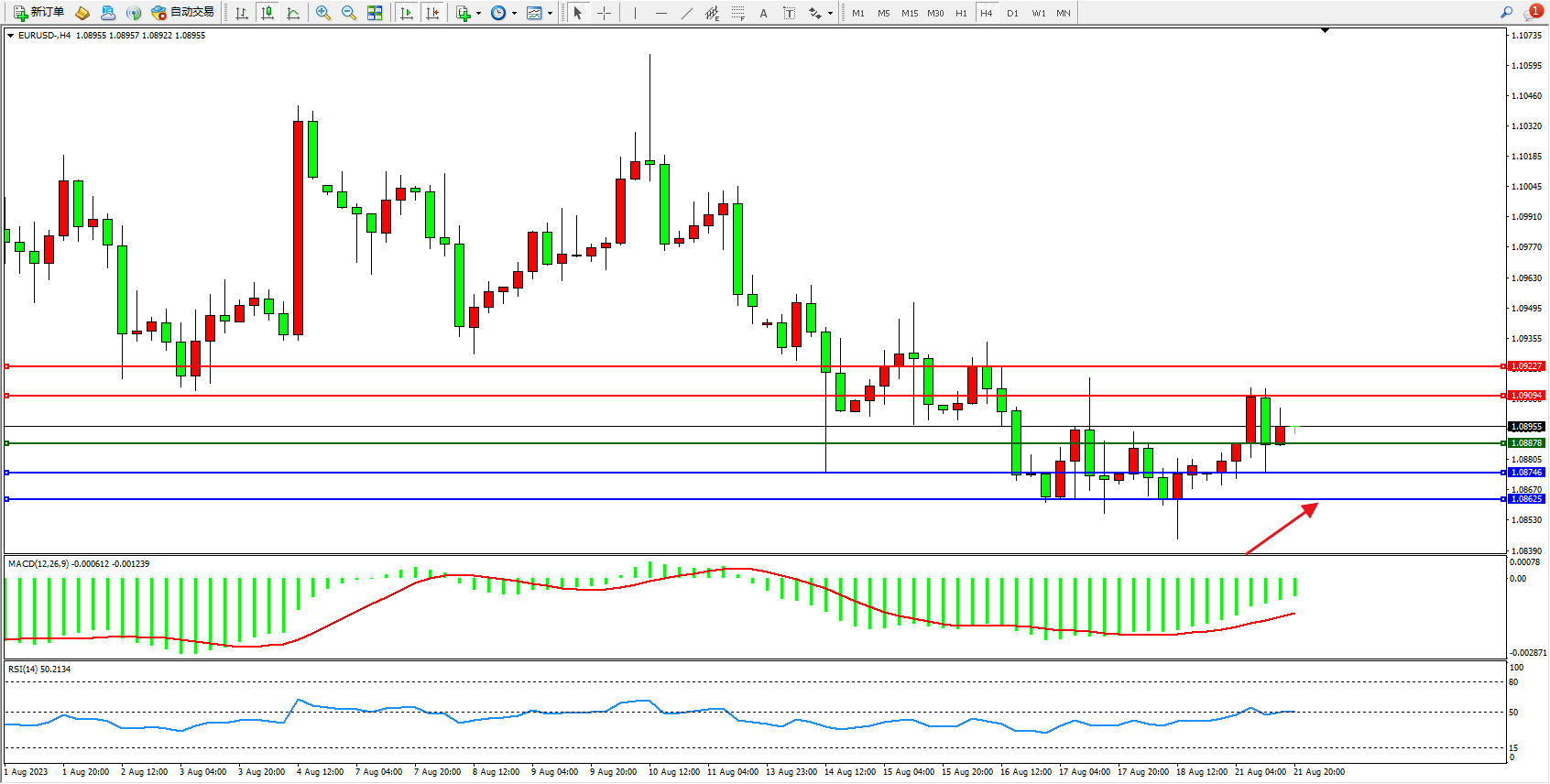 欧元美元EURUSD—4小时K线图显示: