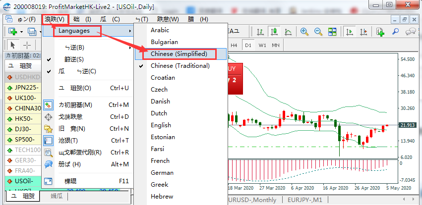 4.如果打开MT4软件显示乱码或英文,请点击显示→Languages→Chinese(Simplified)将语言设置为简体中文,或设置为您所需使用的语言