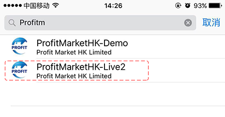 2.选择“登录一个已有账户”,搜索输入框内输入汇富宝的服务器“ProfitMarketHK-Live2”, 如图所示。