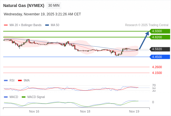 Natural Gas (NYMEX) (JAN6) 当日内: 看涨,当 4.4500 为支撑位。